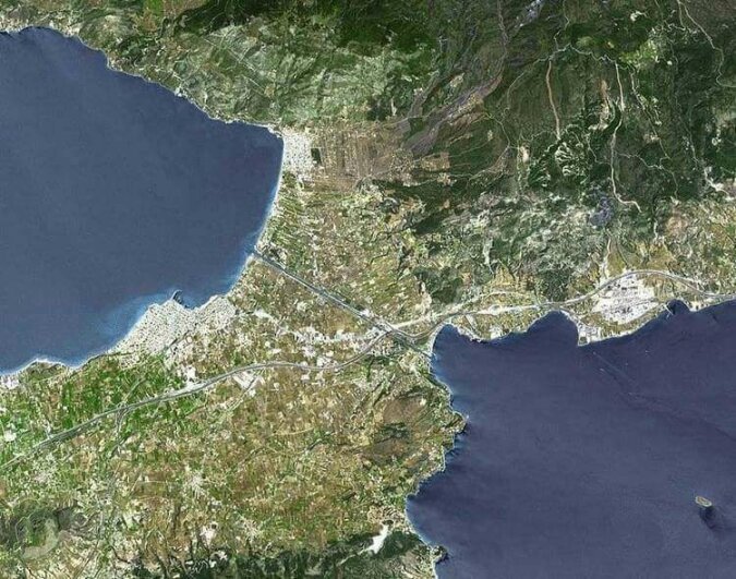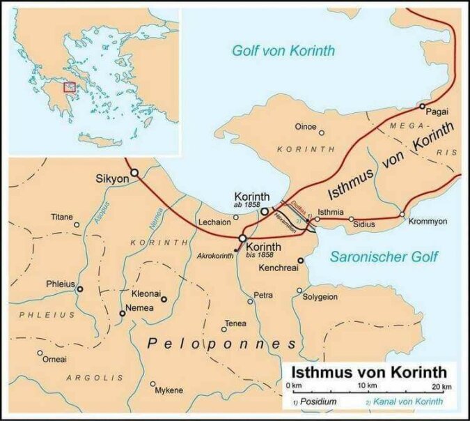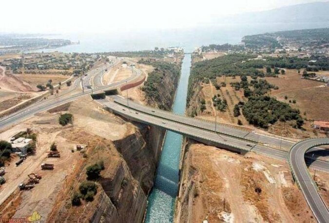 Niejeden władca starożytnego świata marzył o połączeniu Zatoki Sarońskiej na Morzu Egejskim z Zatoką Koryncką na Morzu Jońskim. Przy pomocy takiego kanału można by skrócić drogę wokół półwyspu Peloponez nawet o 400 kilometrów. Kanał zaczął budować starożytny grecki władca Periander w VII wieku p.n.e. Jednak przerażony, że ze względu na różnice w poziomie mórz Egejskiego i Jońskiego mogą wystąpić powodzie, wstrzymał tę imponującą budowę.