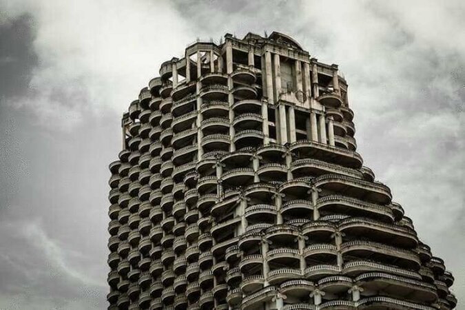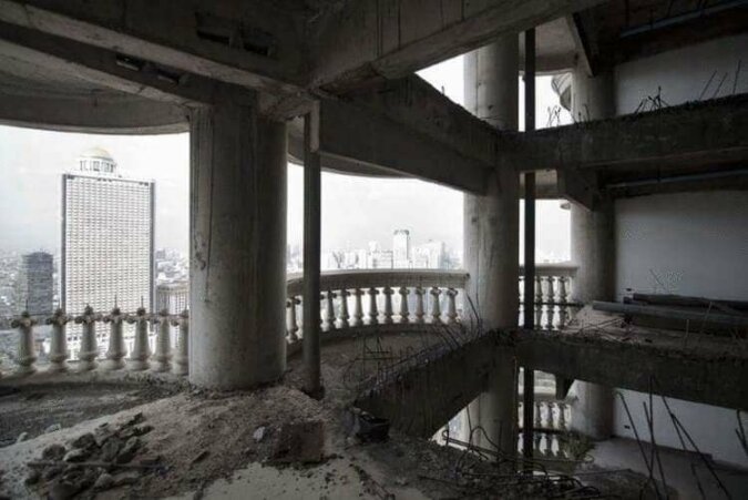 Budowa budynku została wstrzymana w latach 90., kiedy kraj nawiedził kryzys. Po tylu latach jego renowacja kosztowałaby tyle, co budowa nowego, więc niedokończony obiekt stał jako porzucony ogromny głaz.