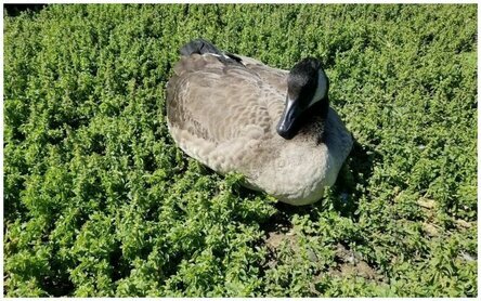 Wygląda tak, jakby ta kaczka była niewiarygodnych rozmiarów i leżała w środku lasu.