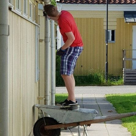 Ten chłopak nie stoi w taczce. Przyjrzyj się bliżej: obok taczki znajduje się stołek.
