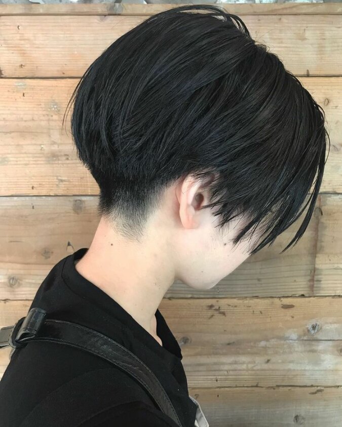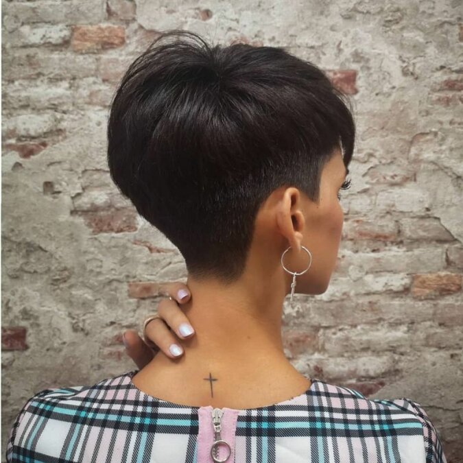 Krótkie włosy, pozostawione z tyłu głowy, pozwalają na uniesienie. Dzięki temu fryzura ma objętość.