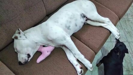W rodzinie jest kilka psów, które nie były zbyt szczęśliwe widząc nowego sąsiada. Ale zwierzak zachowywał się bardzo pewnie, szybko wybierając do spanie ciepłe miejsce na kanapie.