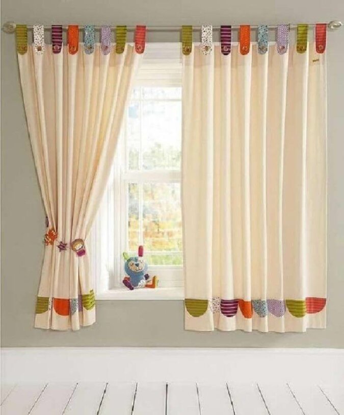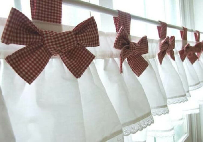 Kolorowe kokardki dodają elegancji białej zasłonie