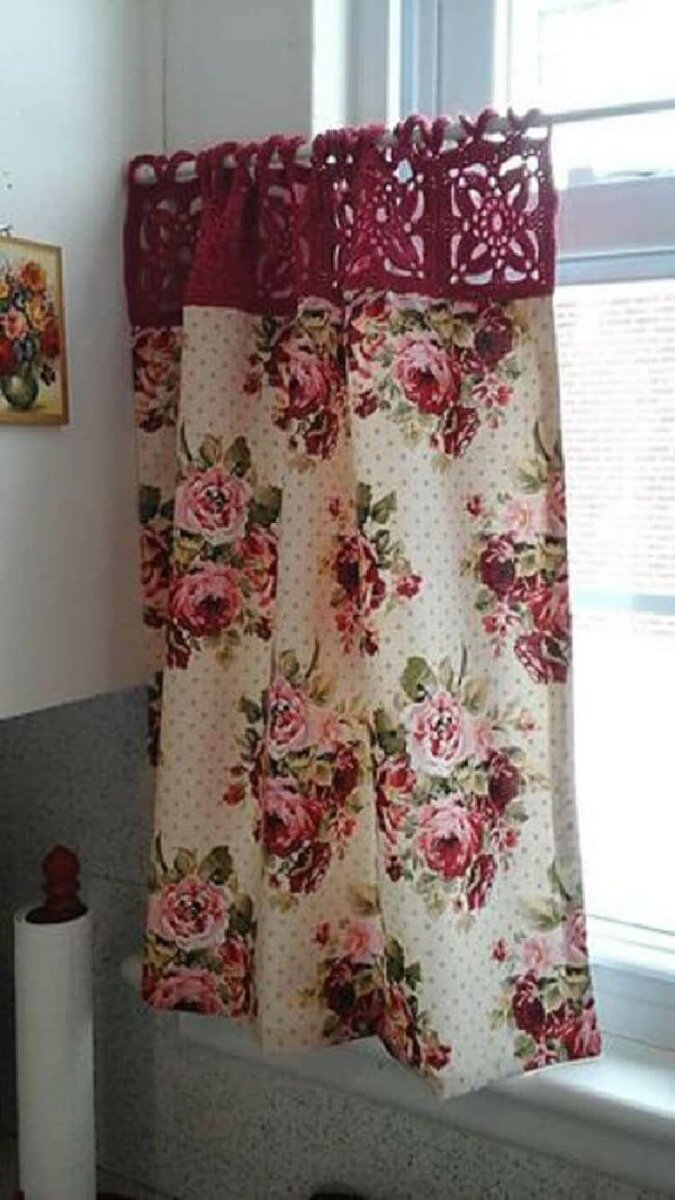 Dzianinowy ornament na górze zasłony wygląda bardzo ciekawie i świadczy o złotych rękach gospodyni.