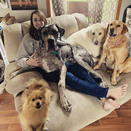 Teraz Maximus ma trzy lata i waży aż 90 kilogramów. W tym czasie Charlie przyzwyczaił się już do obecności nowego członka rodziny, a mała Dahlia stała się jego serdeczną przyjaciółką i partnerką w psotach. Na samym początku psy były mniej więcej tej samej wielkości, ale teraz szpic jest mniejszy od łapy doga, który w ogóle tego nie zauważa.