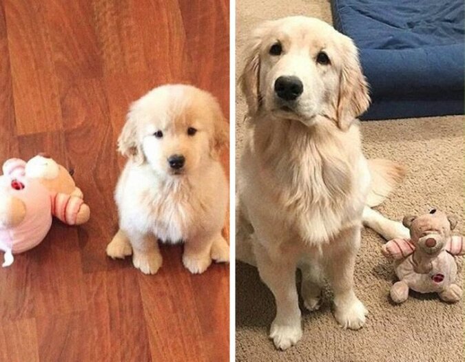 Dzisiaj szczeniak po raz pierwszy wybrał sobie zabawkę. Nie chciał jej puścić w drodze do domu i natychmiast zabrał ją do swojego legowiska