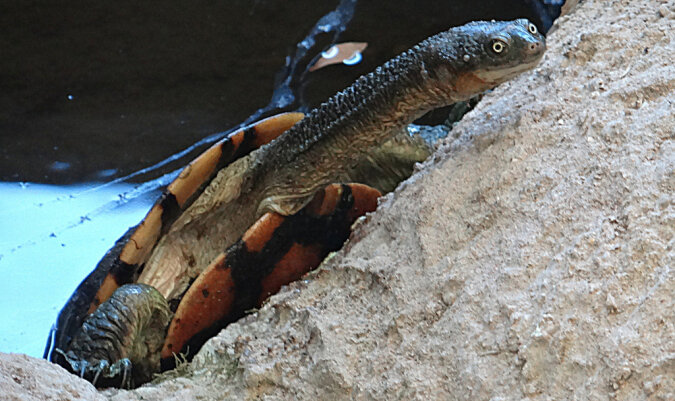 Ten żółw ma bardzo długą szyję, którą jest w stanie całkowicie schować w skorupie