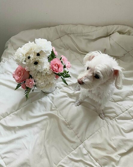 Przyszedł do kwiaciarni z portretem Ellie w telefonie i poprosił o jak największą kreatywność. Następnego dnia prezent był gotowy: delikatny bukiet biało-różowych goździków z parą różowych róż po bokach. Wyglądał dokładnie jak mały biały piesek z kręconą sierścią. Wydawało się, że patrzy na właścicielkę z różowego klombu: jej oczy i nos były zrobione z czarnych guzików.