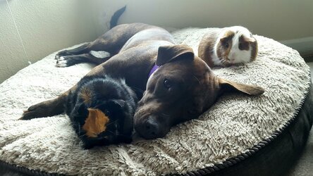 Świnki morskie Frida i Pandora przyjęły psa, który miał ciężką przeszłość. Wygląda na to, że właśnie takiej przyjaźni zwierzak tak bardzo potrzebował.