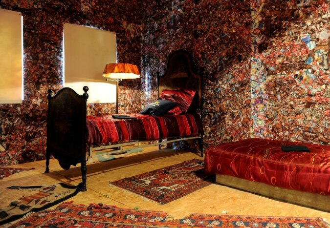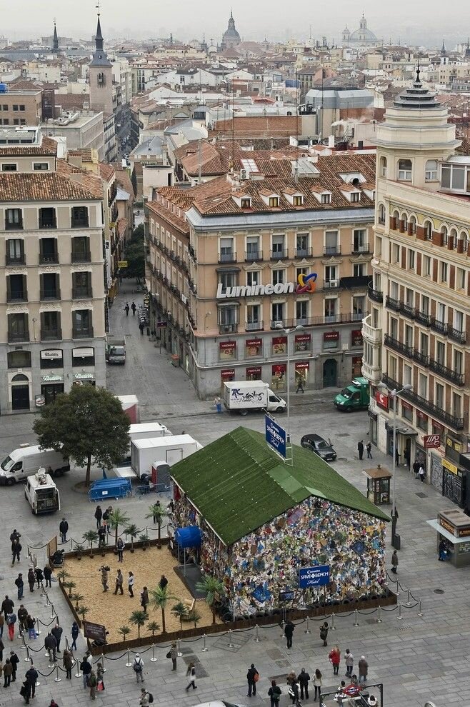 Kilka lat temu aktywiści zbudowali hotel na centralnym placu Madrytu ze śmieci zebranych na lokalnych plażach i pchlich targach. Dwukondygnacyjny budynek oparto na solidnym drewnianym szkielecie, a wewnątrz zaprojektowano pięć pokoi dwuosobowych. Poza biotoaletą nie było żadnych innych udogodnień dla dziesięciu wolontariuszy przebywających w tym hotelu.