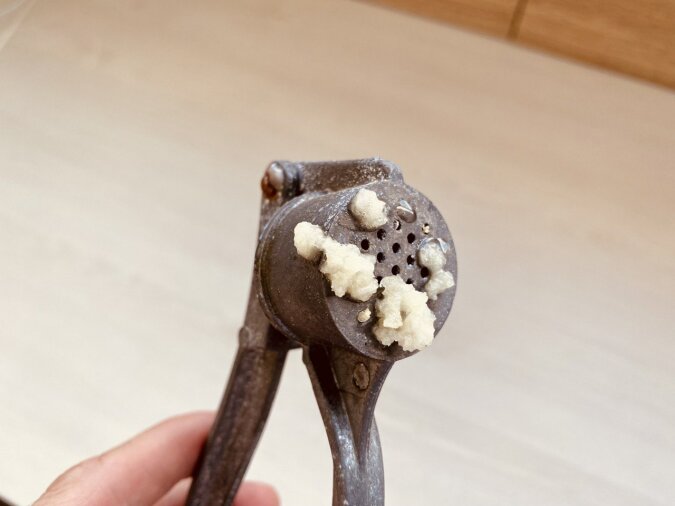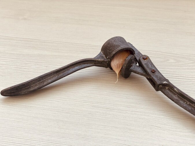 Bierzesz ząbek czosnku i obierasz go. I to jest główny błąd. Tak naprawdę nie trzeba obierać ząbków: włóż do praski bezpośrednio w łupinie w odpowiedniej ilości i wyciśnij.