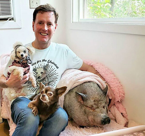 Mieszka u niego w tej chwili 10 psów, jedna prawdziwa wielka świnia, dwie kaczki, dwa gołębie, dwa koty i kilka kurczaków! Taka wielka rodzina!