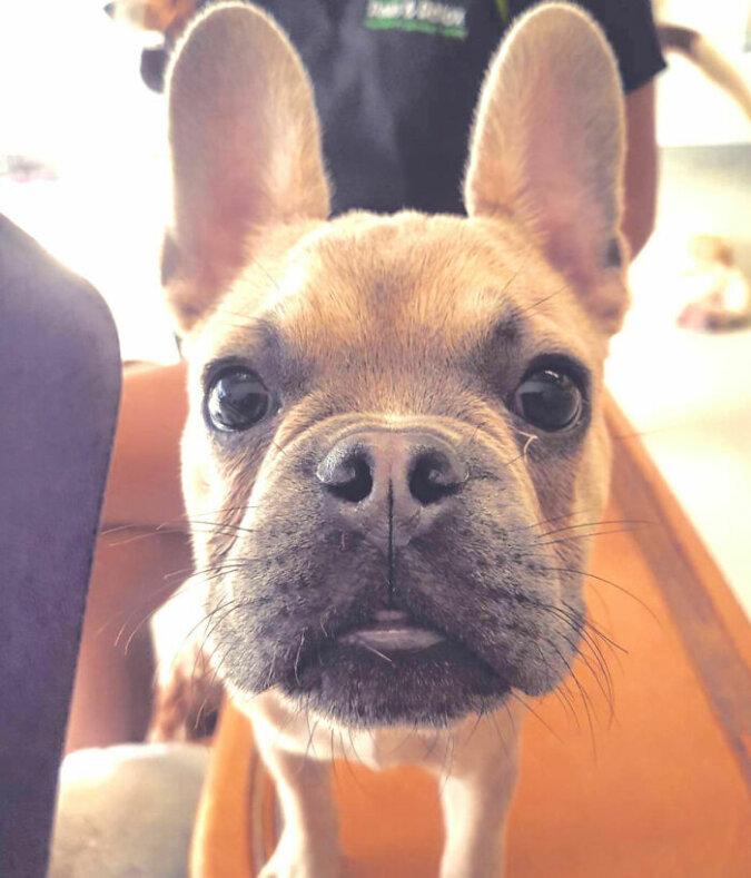 Szczeniak Buldoga Francuskiego patrzy z wyrzutem: co wy ludzie nam zrobiliście?