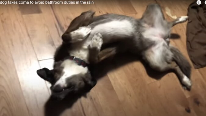 I to nawet nie taka pogoda, że „dobry gospodarz nie wyrzuciłby psa na dwór” - wystarczy mżawka za oknem. Pies znalazł elegancki i całkowicie bezkonfliktowy sposób na uniknięcie konieczności wyjścia w taką pogodę. Nie musi się nawet wysilać.