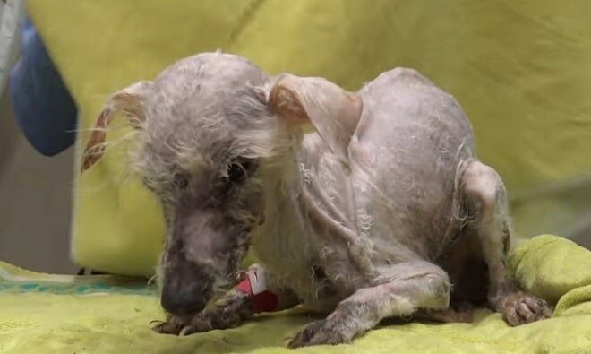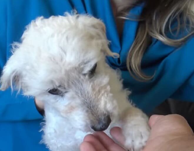 W szpitalu dokładnie zbadano małą, zwracając uwagę nie tylko na jej poparzony pyszczek, ale także na okropne dolne zęby, które sprawiały, że zwierzę nie czuło się komfortowo. Wynikało to z braku opieki nad psem, jak również z braku dbałości o jego sierść, która w niektórych miejscach była wyleniona i pokryta kołtunami.