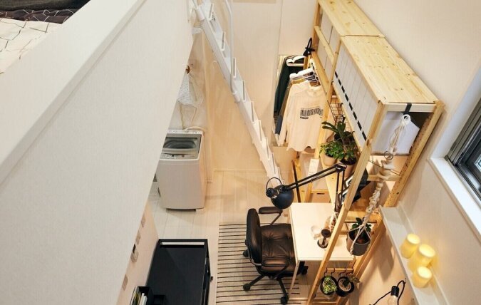 Co zaskakujące, projektanci wnętrz byli w stanie zmieścić dosłownie wszystko, co jest potrzebne do życia na małej powierzchni. Jest kącik roboczy ze stołem i krzesłem, garderoba, kanapa, pralka, a nawet łóżko dla dwóch osób. Można się na nie wspiąć po cienkiej metalowej drabinie.