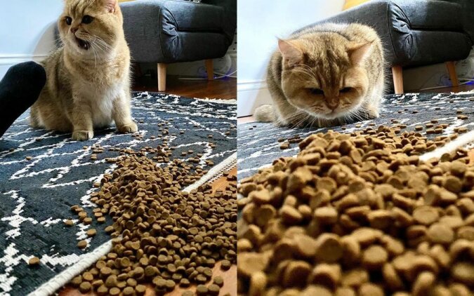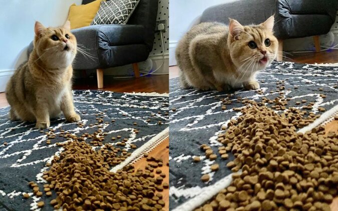 Pewnego dnia Kelly przez przypadek rozsypała karmę swojego kota. Na tych zdjęciach właścicielka postanowiła uchwycić konsekwencje, ale jednocześnie uchwyciła niesamowitą reakcję zwierzaka.