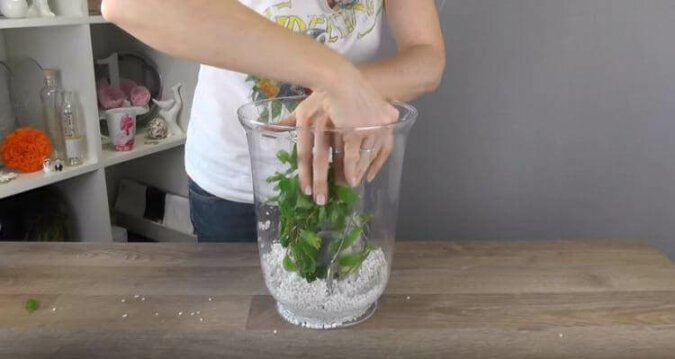 Umieść żwir na dnie szerokiego wazonu. Można go zastąpić pięknym, jasnym piaskiem.