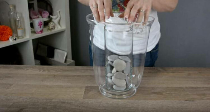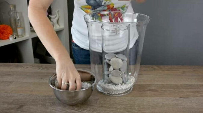 Do dekoracji można użyć kamyków morskich lub innych ładnych kamieni. Umieść wąski wazon w szerokim wazonie i wypełnij ten pierwszy do połowy kamieniami.