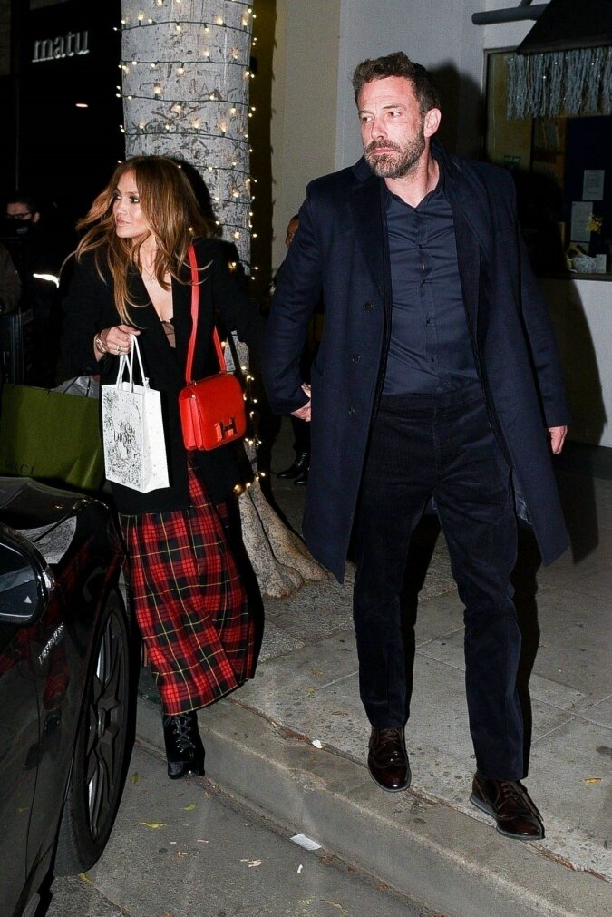 Na randkę z ukochanym Jennifer wybrała spódnicę maxi w kratę marki Roberto Cavalli, którą połączyła z czarnym półprzezroczystym topem i wydłużonym dwurzędowym żakietem. Sznurowane botki na platformie dodały sylwetce subtelności, a jaskrawoczerwona torebka Hermes Constance była efektownym elementem stylizacji. Lopez trzymała w ręku małą torebkę Dior, w której zazwyczaj sprzedaje się biżuterię. Gdy fani to zobaczyli, założyli, że musiał to być prezent od jej ukochanego.