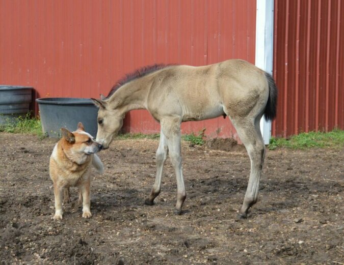 Zip i Tai spotykali się każdego ranka, gdy Carla otwierała stodołę, by wypuścić źrebię na świeże powietrze. Gdy robiła to wolniej niż zazwyczaj i nie wchodziła do środka, pies szturchał ją, jakby mówiąc, żeby wprowadziła jego przyjaciela. Przez pierwsze kilka tygodni źrebak nie chciał wychodzić na świeże powietrze, dlatego Zip kładł się obok niego i spędzał z nim cały dzień.