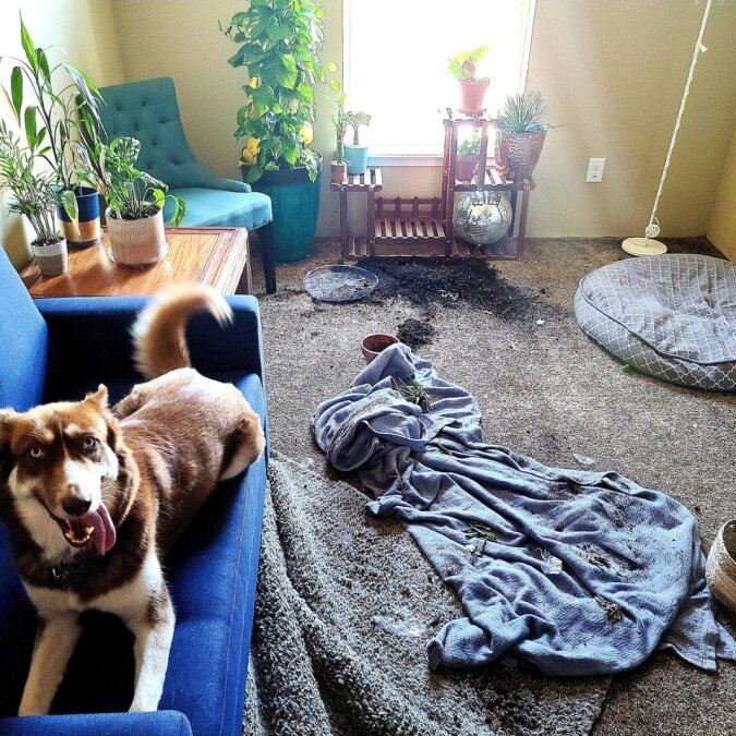 Kwiat w doniczce sam się zniszczył. Pies nie miał z tym nic wspólnego.