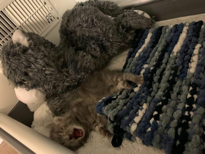 W schronisku okazało się, że kotek, któremu nadano imię Harvey (pełne imię Harvest), nie był całkowicie ślepy. Miał stan zapalny spowodowany infekcją, ale po kilku dniach troskliwej opieki już poczuł się lepiej. Wychudzone maleństwo umieszczono na jakiś czas w inkubatorze w komfortowej temperaturze.