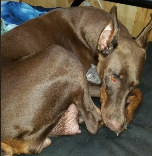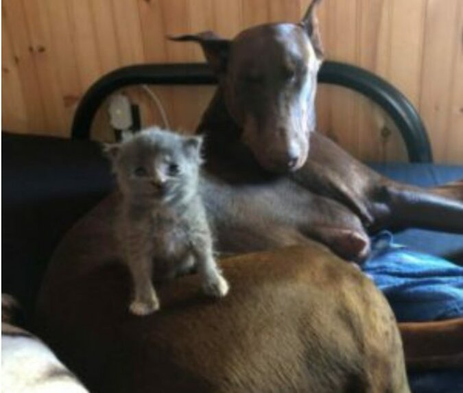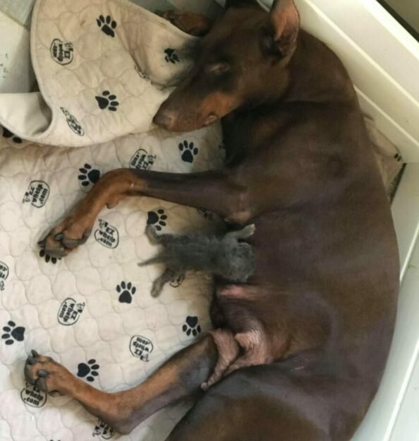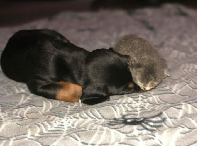 Kobieta zabrała kociaka do domu. Miała już sunię o imieniu Rocky, która kilka dni wcześniej urodziła szczeniaki. Kobieta obawiała się, że Rocky będzie nieufna, a nawet agresywna wobec kociaka, ale sunia natychmiast zaakceptowała maleństwo.