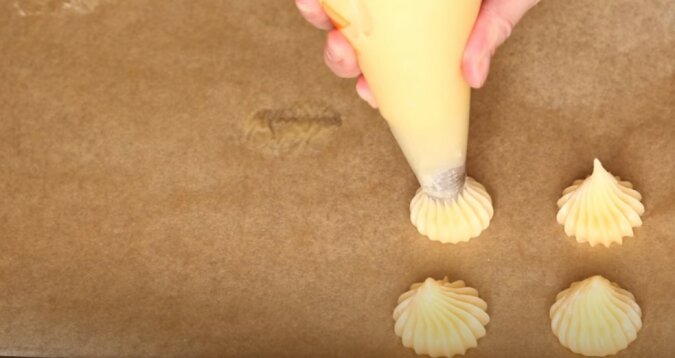 Wyłóż blachę do pieczenia pergaminem i wyciskaj ciasto w kształcie małych kulek za pomocą worka do ciasta z odciętym rogiem lub za pomocą rękawa cukierniczego.