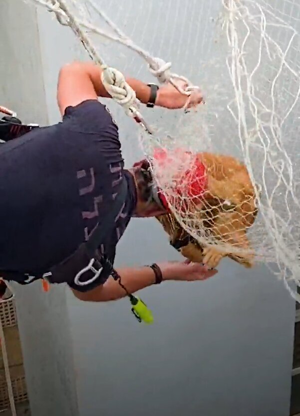 „Bili nie przepada za ludźmi, więc bałam się, że ugryzie strażaka, ale był bardzo spokojny i nawet pozwolił się pogłaskać” - mówi właścicielka. Jeden ze strażaków przy pomocy specjalnych lin zszedł do psa i po krótkiej chwili udało mu się wyciągnąć Bili. W końcu znalazł się na wolności!