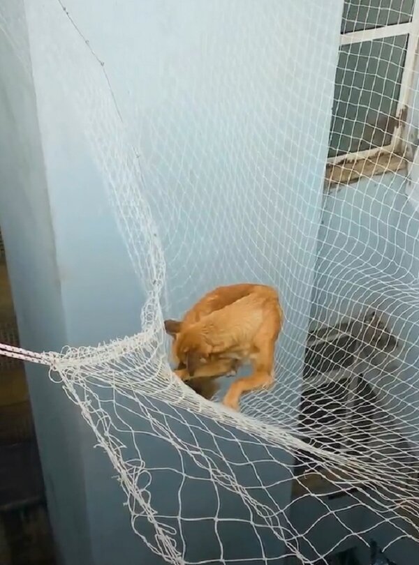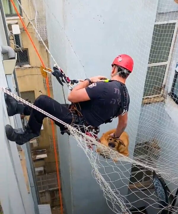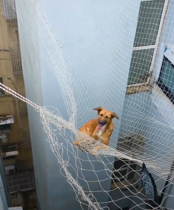 Mieszkańcy Izraela zauważyli tego psa na siatce dla ptaków między domami. Najwyraźniej biedactwo wdrapało się tam z ciekawości lub w pogoni za ptakiem - ale trudno było mu się z powrotem wydostać. Pies wisiał w siatce na wysokości sześciu pięter, drżał ze strachu i bał się poruszyć.
