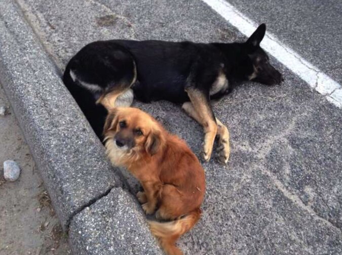 Mały rudy piesek krążył wokół ciężarnej owczarki, która została potrącona przez samochód. Pies pilnował przyszłej matki i próbował szukać pomocy, ale kierowcy przejeżdżających samochodów zwyczajnie ignorowali zwierzęta.