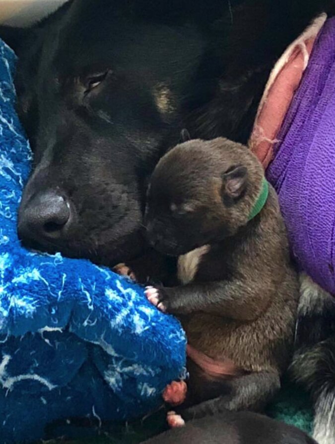 Stwierdzono, że ciężarna suczka miałapoważne złamania, ale poza tym dobrze się trzymała, a ponadto jej szczenięta nie odniosły obrażeń. W ciągu kilku dni suka urodziła 11 maleńkich dzieci.