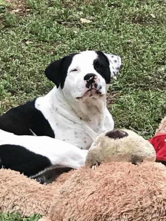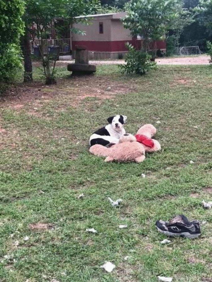 Inna działaczka na rzecz praw zwierząt, Distaini, odpowiedziała na ogłoszenie - pojechała po psa, aby zabrać go do domu tymczasowego. Będąc na miejscu, dziewczyna z daleka zauważyła, że pies leży nieruchomo w trawie, a obok niego brudny pluszak...