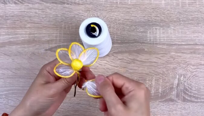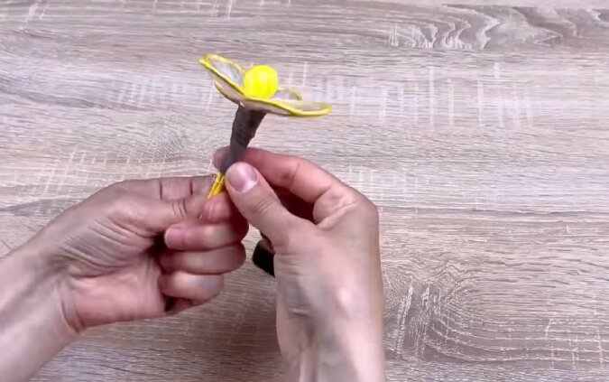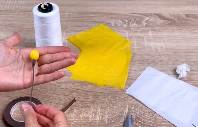 Schowaj cewkę z resztą drutu pod taśmą izolacyjną i owiń łodygę po całej długości. Na tej samej zasadzie można wykonać potrzebną ilość kwiatów.