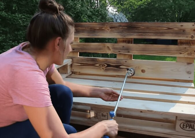 Aby stworzyć oparcie, jedną z palet należy przepiłować wzdłuż. W ten sam sposób postępuj z podłokietnikami, ale pozostaw tylko jedną deskę na to zamiast trzech.