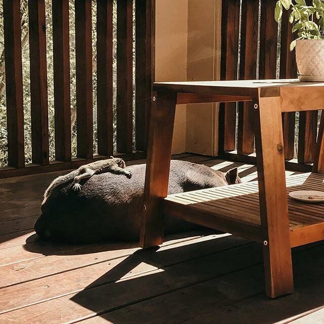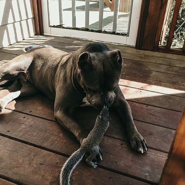 Everly nie opuściła swojego futrzanego przyjaciela. Niegdyś walczący pies, który teraz pożycza swój grzbiet jako poduszkę dla małej wiewiórki.