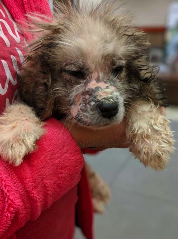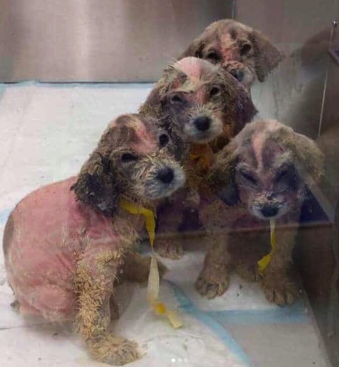 Szczenięta tak bardzo śmierdziały, że pracownicy musieli założyć maski, aby je wykąpać. Ponadto miały świerzb, były bardzo wychudzone i zmarznięte. Ponieważ były pozbawione sierści, nie można było określić ich rasy. Pracownicy schroniska założyli, że psy będą małe, gdy dorosną. Zaczęli leczyć je, a po zakończeniu leczenia znaleźli ludzi, którzy je przygarnęli.