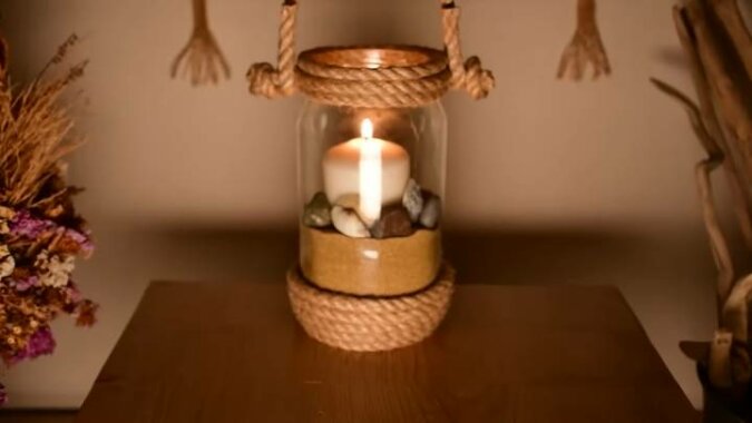Ze szklanego słoika otrzymujesz niesamowicie piękny, a jednocześnie dość prosty wystrój, który każdy może zrobić. Aby to zrobić, będziesz potrzebować również liny lub juty, a także piasku i małych kamieni.