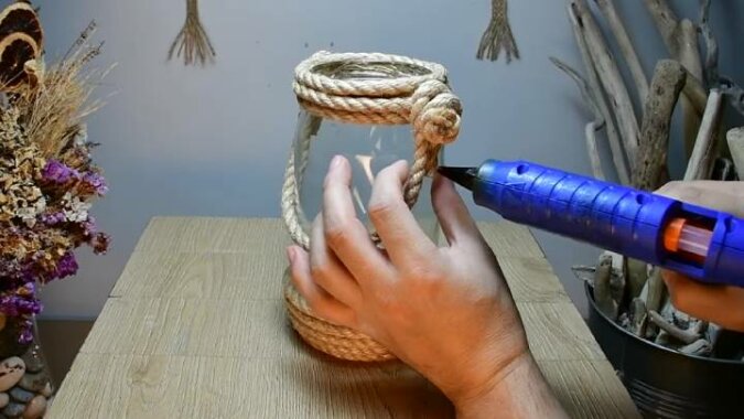 Przyklej linę do dna i góry słoika. Z tej samej liny zrób także „uchwyt”.