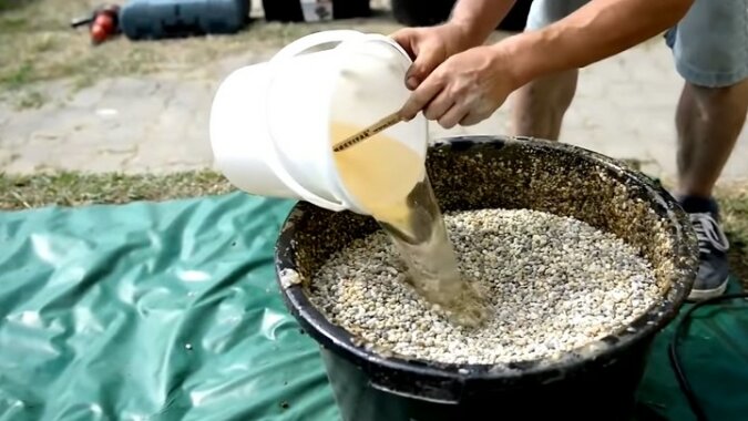 Następnie składniki są dokładnie mieszane. Jeśli żwir jest zapylony, można go wcześniej umyć i wysuszyć.