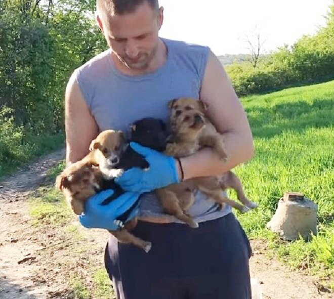 Gdy maluchy się najadły i ugasiły pragnienie, wolontariusz delikatnie podniósł je i zaniósł do samochodu. Szczeniaków okazało się być w sumie pięć: cztery dziewczynki i jeden chłopiec. Spokojnie dali się zabrać z leśnej polany, odczuwając w pełni życzliwość ludzi.