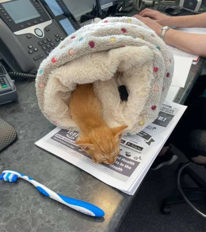 Kociak był zaniedbany i odwodniony, przez co wyglądał na jeszcze mniejszego, a nawet nie można było po nim określić jego prawdziwego wieku. Wolontariusze jeszcze tego samego wieczoru szukali kolejnych kociąt w okolicy, ale nie znaleźli.