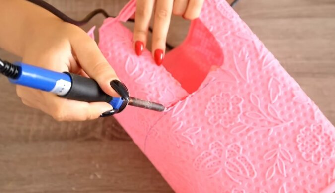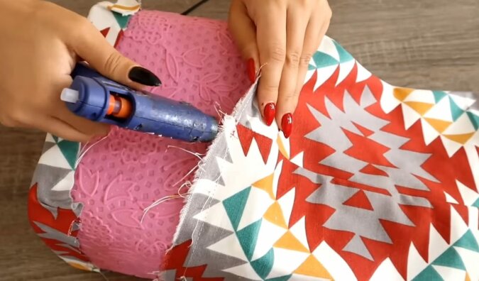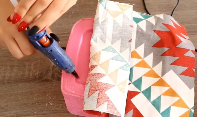 Naciągnij tkaninę na górną część pojemnika i użyj pistoletu do kleju. Ostrożnie odetnij nadmiar tkaniny i wystające nitki.