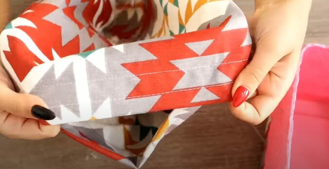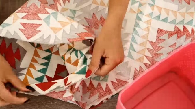 Weź tyle tkaniny, aby całkowicie owinąć pojemnik i dodaj 2 cm dla bocznego szwu i jeszcze dodatkowe 2 cm. Złóż na pół i zszyj wzdłuż dłuższego boku.
