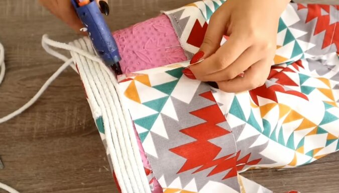 Udekoruj koszyk wzdłuż górnej i dolnej krawędzi za pomocą grubego sznurka, używając do tego pistoletu do kleju. Sznurek powinien zasłaniać miejsca łączenia elementów tkaniny.
