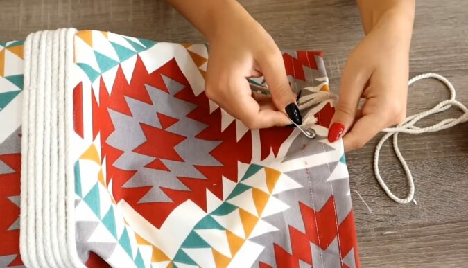 Zrób otwory między ściegami wzdłuż górnej krawędzi i włóż sznurek. Zawiąż ładnie lub użyj dowolnej ozdoby.