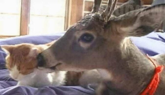 Początkowo jelonek nie mógł w żaden sposób przyzwyczaić się do ludzi, ponieważ wszystko było dla niego niezwykłe i dziwne. Wkrótce jednak stał się bardziej zadomowiony i otwarty, ponieważ kot wziął go pod swoje „skrzydła”.