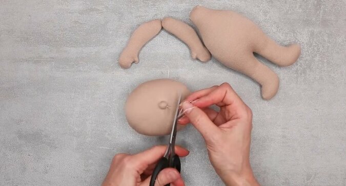 Wykonuj nacięcia i wywijaj elementy za pomocą ostrego patyczka lub igły dziewiarskiej. Po tym, jak lalka będzie wypchana, zaszyj. Przyszyj ramiona do tułowia. Umieść koralik w środku, tam gdzie powinien znajdować się nos. Zaszyj dziurę.