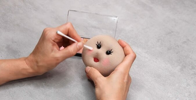 Zaznacz oczy, zrób rzęsy i przyszyj koraliki - tam gdzie powinny być oczy. Narysuj i wyhaftuj usta. Użyj cieni, aby pojawił się rumieniec.